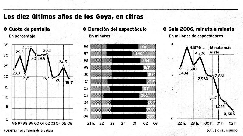 Sé que lucho contra una arraigada costumbre de la prensa económica. Pero me resisto a darla por buena. Y tengo adeptos. Miren qué gráficas tan pocholas publican los de la sección de Cultura, a cuenta de la gala de los Goya. Fíjense, sobre todo, en el espacio "vacío" de la gráfica de la izquierda, por debajo del nivel 15. ¿Desperdicio de papel? Ni hablar. Ese espacio en blanco es información también. Nos permite ver la verdadera dimensión de la caída de audienca en los últimos años. Enhorabuena, chicos. A ver si ahora convencéis a los de la Bolsa.